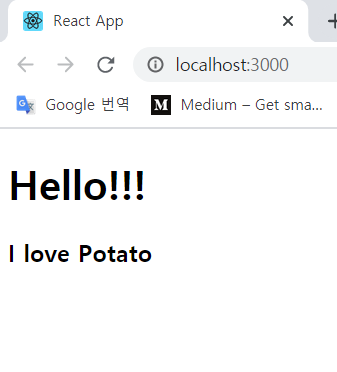 App.js에서 만들어놓은 Potato.js라는 컴포넌트를 jsx형식으로 끼워넣어주고 App만 렌더링하면 브라우저에서는