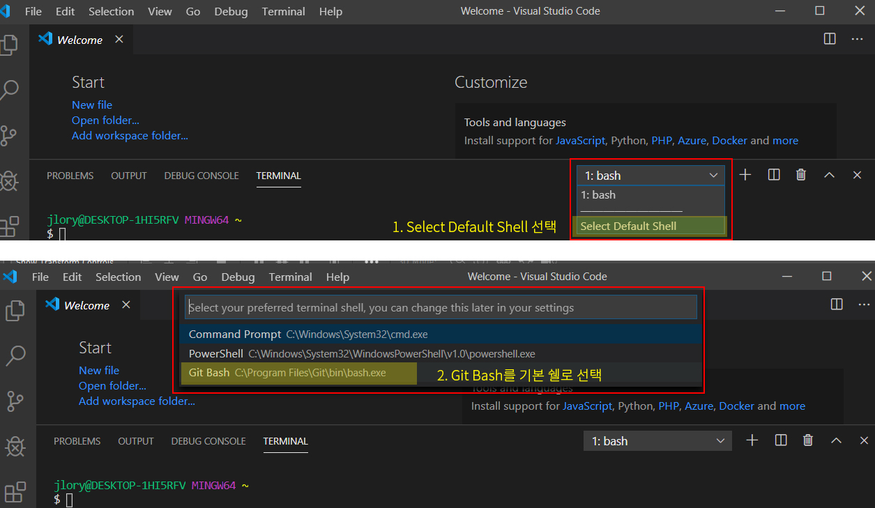 그래서 vsc설정을 바꾸어 터미널이 파웨쉘이 아닌 배쉬창으로 열리게 만들었다.