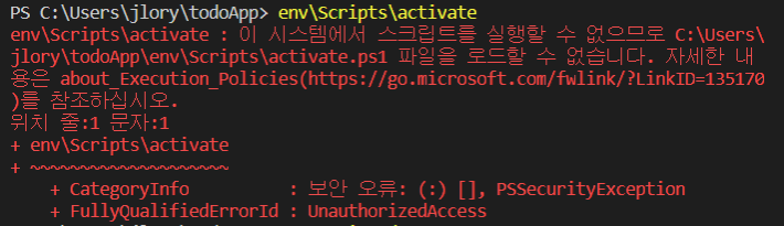 에러1 "이 시스템에서 스크립트를 실행할 수 없으므로 C:\Users\jlory\todoApp\env\Scripts\activate.ps1 파일을 로드할 수 없습니다"