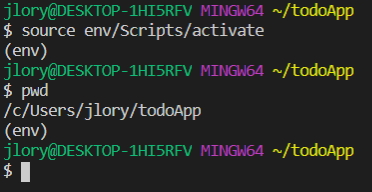 (리눅스는 env/bin/activate지만 윈도우는 env/Scripts/activate임. 왜냐? activate.bat이라는 파일이 저 경로에 있기 때문)