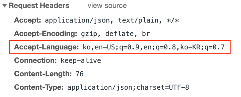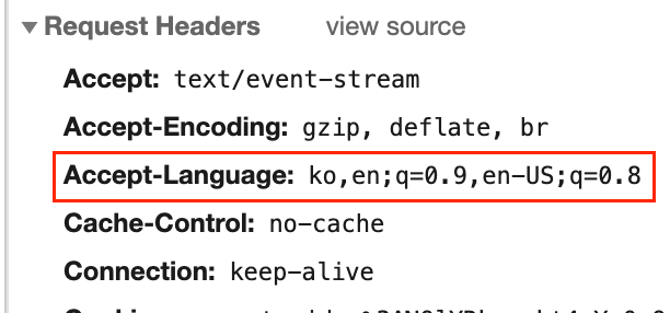 Accept Language 값은 요청 HTTP 헤더의 기본값으로 어떤 언어를 클라이언트가 이해할 수 있는지, 지역 설정 중 어떤 것이 더 선호되는지를 알려준다. 사용자의 ip 에 기반하여 지역을 알려주는 것이 아니라, 사용자의 경험에 기반하여 사용자에게 더 친숙한 언어가 무엇인지를 알려주는 것이다.