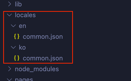 /locales 폴더를 생성한 후 그 안에 각각 필요한 언어 폴더를 만들고 그 안에 common.json 이라는 json 파일을 만든다.