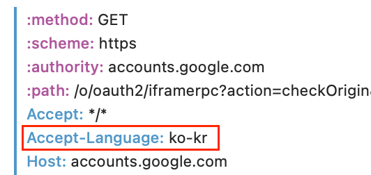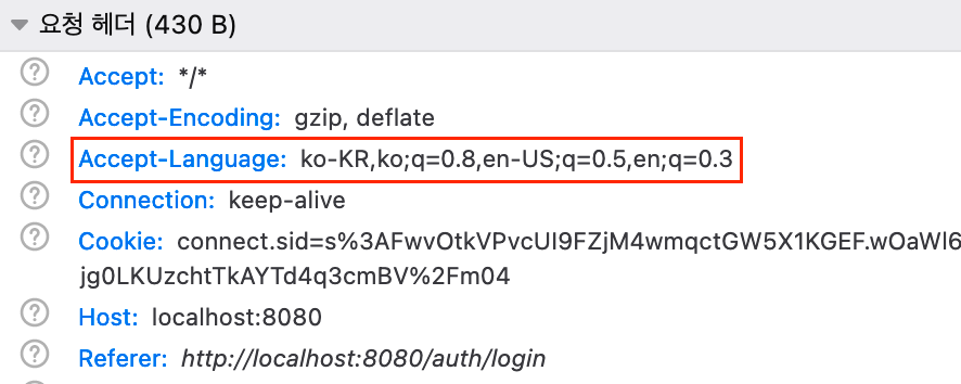 Accept Language 값은 요청 HTTP 헤더의 기본값으로 어떤 언어를 클라이언트가 이해할 수 있는지, 지역 설정 중 어떤 것이 더 선호되는지를 알려준다. 사용자의 ip 에 기반하여 지역을 알려주는 것이 아니라, 사용자의 경험에 기반하여 사용자에게 더 친숙한 언어가 무엇인지를 알려주는 것이다.