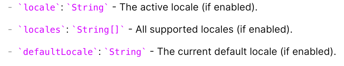 locale - 현재 활성화된 언어값, locales - 지원하는 언어 목록, defaultLocale: 디폴트 값
