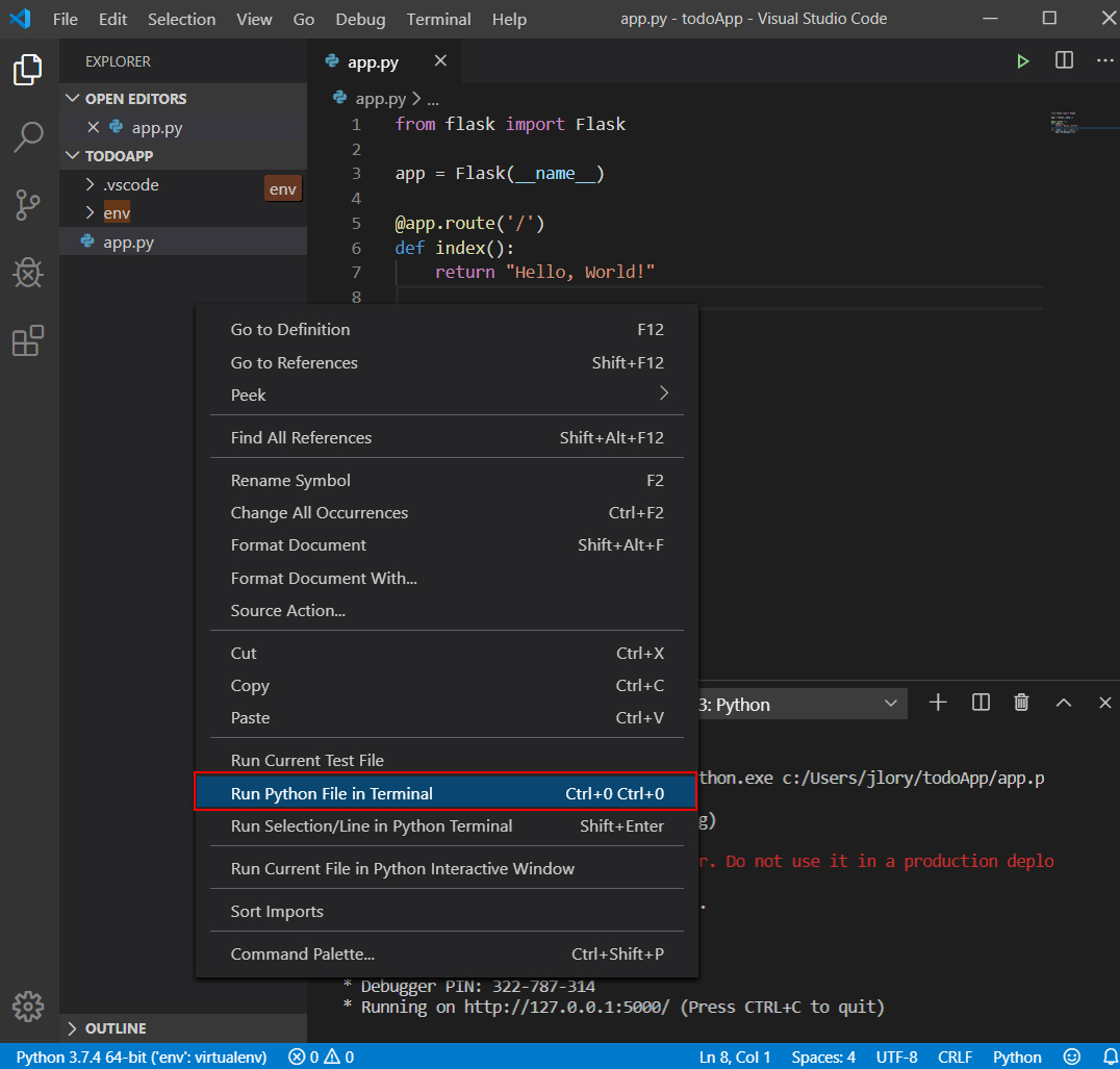 - 코드창에서 마우스 우클릭 > Run Python File in Terminal을 누른다.
