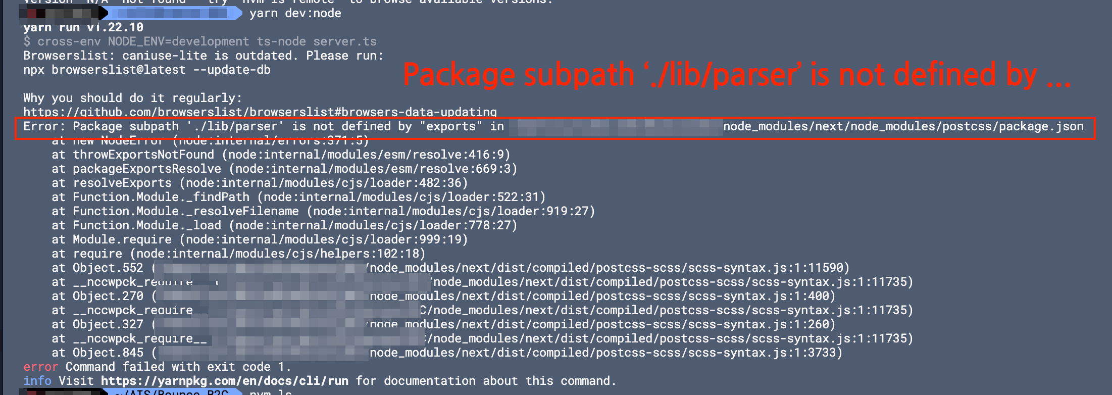 로그는 Error: Package subpath './lib/parser' is not defined by "exports".. (이하 생략)