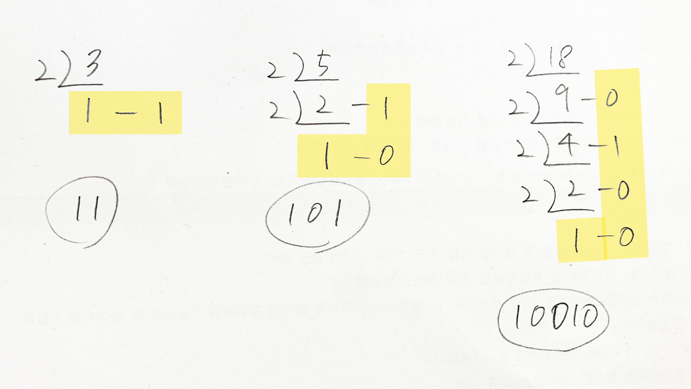 10진수로 된 정수 a를 2진수로 바꾼다고 하면 a를 2로 나눈 나머지와 몫을 다시 2로 나눈 나머지, 몫을 다시 2로 나눈 나머지,, 이렇게 몫을 더이상 2로 나눌 수 없을 때까지 2로 나누고 나머지를 기억해놨다가 이어붙이면 된다.