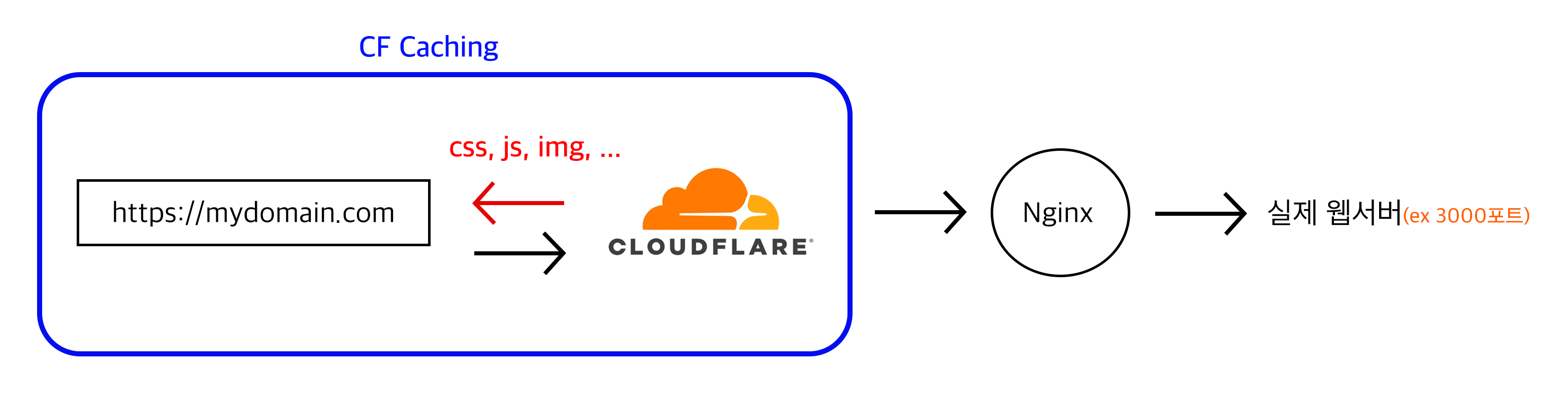 클라우드플레어 없이 엔진엑스에서 캐싱을 한다면 위 그림처럼 요청서버와 엔진엑스 사이에서 일어날 것이다.