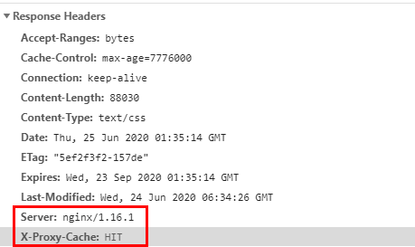 Response Headers에 "X-Proxy-Cache" 속성이 프록시 서버 캐싱 여부를 말해준다.