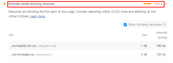 Eliminate render-blocking resources 시간이 확연히 줄어든 것을 볼 수 있다.